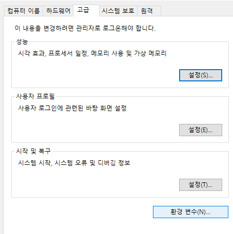 3) [고급 시스템 설정] - [고급] - [환경변수]