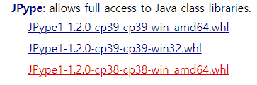 (다운 받을 JPype 파일이 파이썬의 버전에 따라서 달라진다.)