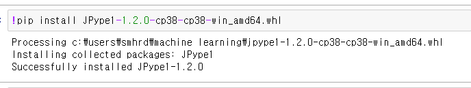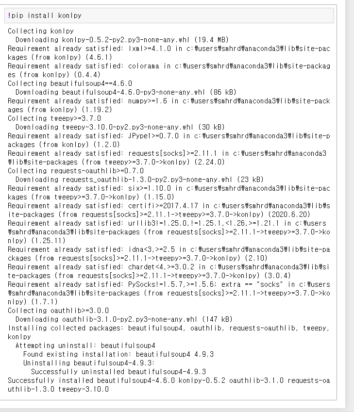 마지막으로 코드를 통해 konlpy 을 설치한다.