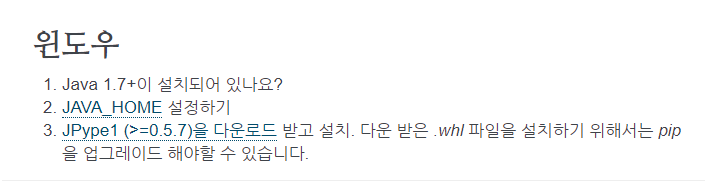 공식 홈페이지에 나와있는 KonlPY 파일 설치 방법이다.