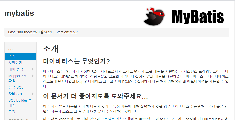 'docs'를 누르면 MyBatis에 대한 설명을 한국어로 볼 수 있는데,