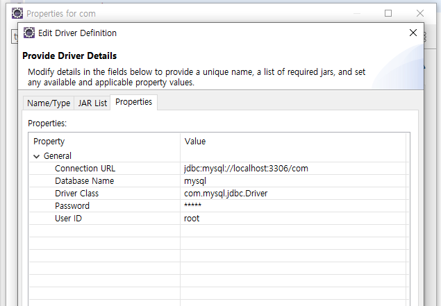 driver, url, username, password를 설정해 놓은 properties 파일을 만들어야함